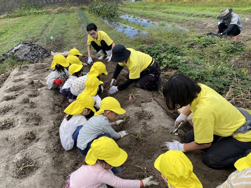 道場南口園で様々なイベントや栽培・収穫をしております。 5月は、いちご狩り 10月は、さつま芋掘り 春は、ジャガイモ・タマネギ・ニンジンなど・・・ 夏は、夏野菜ピーマン・トマト・キュウリ・オクラなど・・・ 秋は、カボチャ・サツマイモ・黒豆のエダマメなど・・・ 季節に合わせて様々な野菜を栽培し給食提供。 また、保育所イベントで景品としても野菜プレゼント。 保護者の方々にもこども達の食べてるお野菜を食べて頂いてます。とても好評です!!