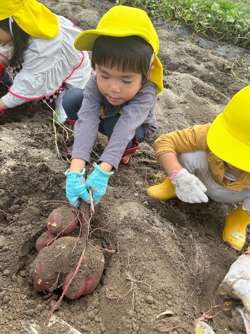 10月の園の保育風景の写真は、かたつむりファームでの「おいもほり」です。